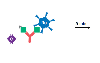 Around 20µl/ 12µl of the patient sample gets incubated with a mix of biotinylated and ruthenylated nucleocaspid (N) antigen. In the presence of corresponding antibody it would result in a double antigen sandwhich immune complex, due to the presence of the two antigens. This can be seen in the next image. It is then incubated for 9 minutes.