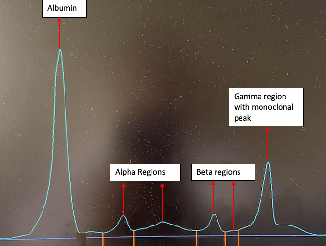 The sample was run for electrophoresis and a monoclonal peak had been detected in the gamma region.